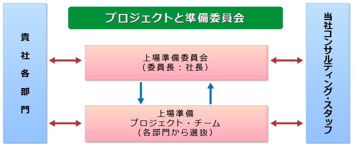当社は、上場準備委員会とプロジェクト・チームの双方に関与し、以下のサポートを行います。
